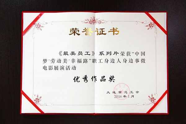 2016年2月,大连市总工会以“中国梦·劳动美·幸福路”为主题开展微电影创作和展演活动,利用微电影这种艺术方式,引导广大职工为加快推进我市“两先区”建设,谱写中国梦大连篇章贡献智慧和力量。期间,收到各区市县总工会、开放先导区总工会、产业工会,各基层工会和广大职工的千部作品。经评委会评选,大连视龙影视拍摄制作的《最美员工》系列片荣获“中国梦·劳动美·幸福路”职工身边人身边事微电影展演活动的优秀作品奖,并颁发荣誉证书与奖杯。 此系列影片分为《最美好员工》、《最美好医生(护士)》、《最美好幼师》、《最美好社工》四部工作纪实片,片中通过纪实跟拍,真实记录了工作在各个岗位上的员工的平凡事迹。 未来,视龙影视会带着这份荣誉,不懈努力,再争佳绩,为您记录每一个感动的瞬间!